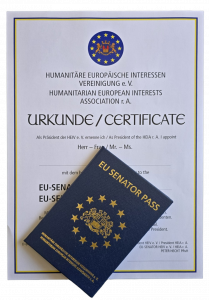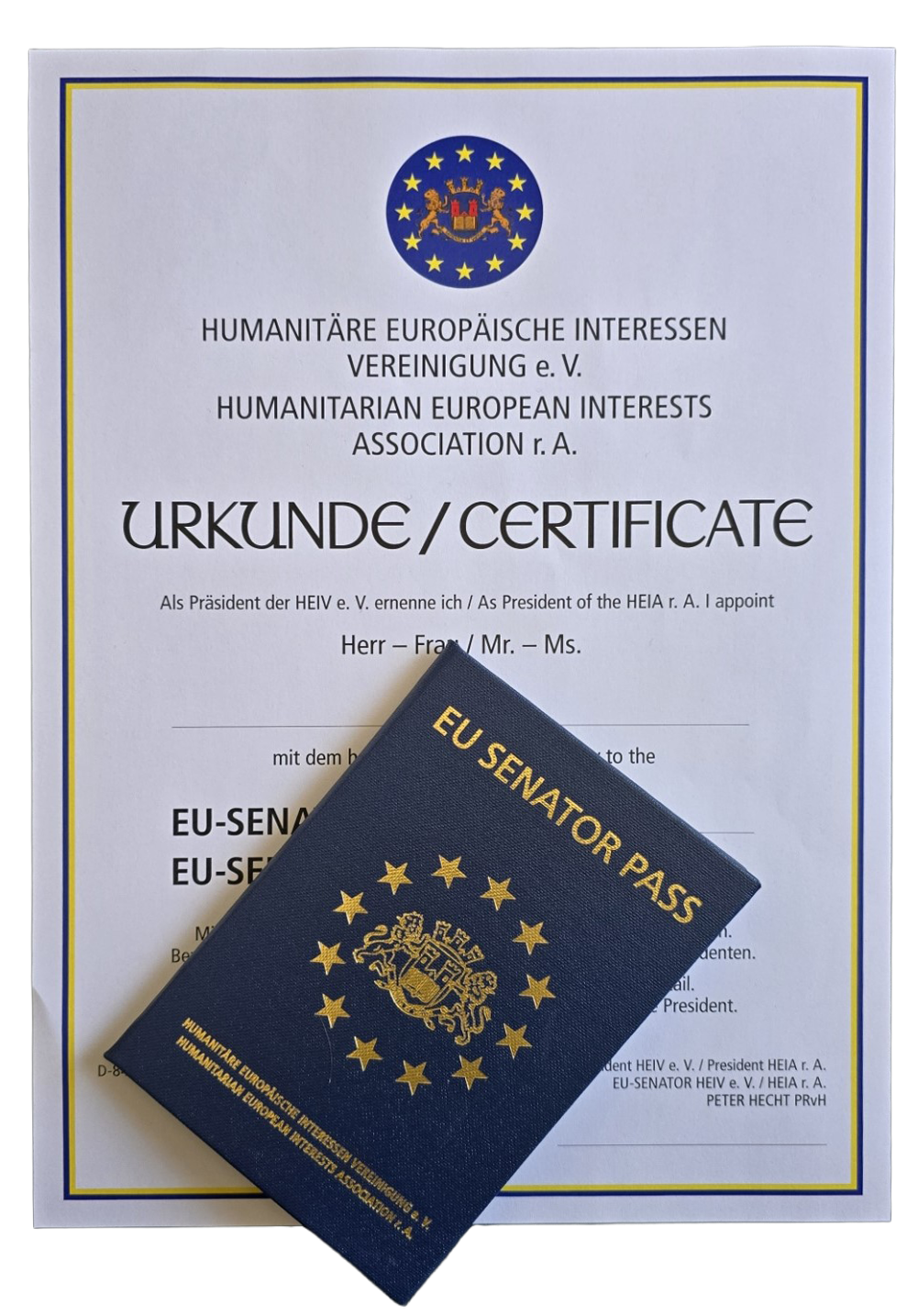 Mit der Berufung zum EU SENATOR HEIV e. V. erhält der neue Senator einen EU – Senator Pass und eine Ernennungsurkunde. Weitere Insignien können über das Präsidium bezogen werden.